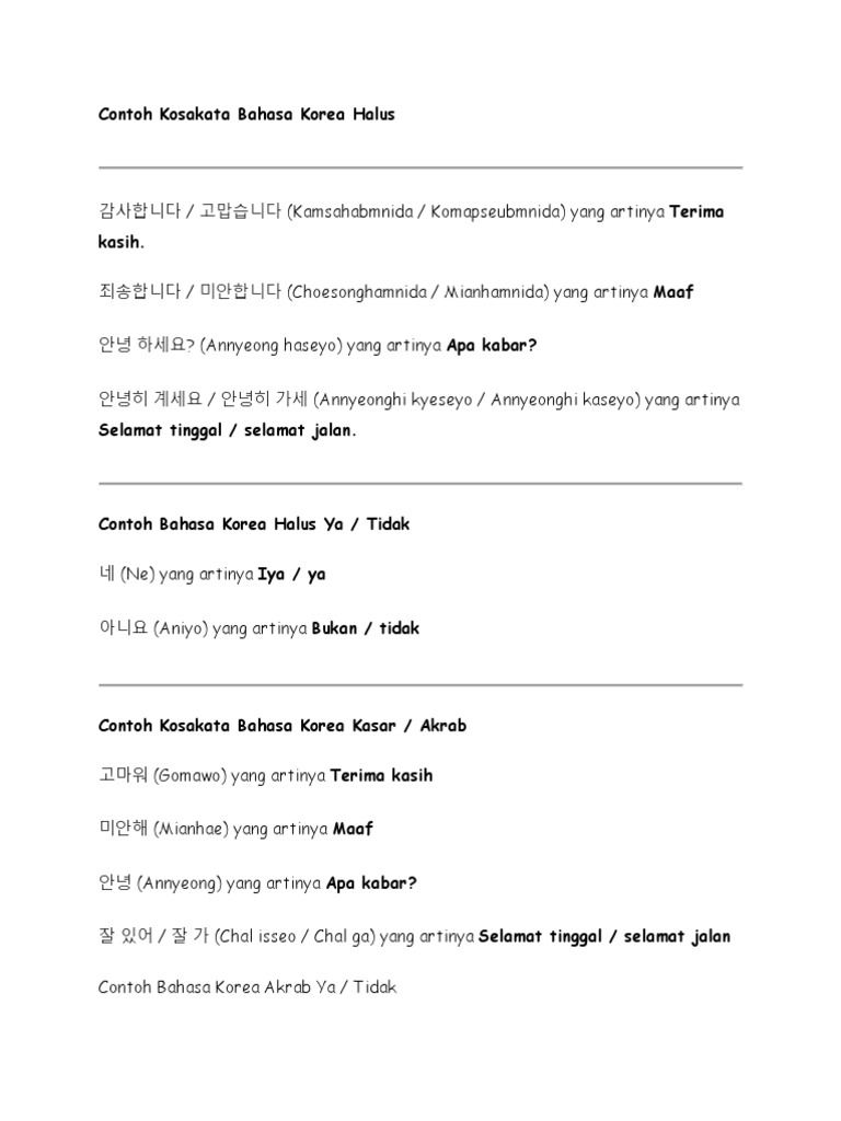 Majalah korea (feb 2017) majalah korea (juni 2017) partikel 이/가 (i/ga) partikel 은/는 (eun/neun) partikel 을/를 (eul/reul) partikel 와/과 (wa/gwa) k onjugasi kata kerja dalam bahasa korea. Masukkan alamat surel anda untuk berlangganan blog ini dan menerima. Bagaimana anda mengatakan „ halo. Kita pasti pernah mengalami sudah susah payah menghafal kosa kata bahasa korea tapi cepat lupa lagi, atau bahkan kita mengalami kesulitan saat menghafal kosa kata baru. Berkaitan:daftar kosakata persamaan kata bahasa korea dan artinya pdf. Di dalam bahasa korea terdapat banyak struktur kalimat, terutama penulisan dari huruf menjadi sebuah kalimat. Dengan adanya aplikasi ini para pengguna bisa belajar berbagai macam huruf. Dengan mengklik tombol printer, anda dapat mencetak seluruh tema dari ungkapan. A short summary of this paper. Dengan dilengkapi oleh kosakata ini, anda pasti akan lebih menikmati liburan anda di negara korea. Dengan mengklik tombol printer, anda dapat mencetak seluruh tema dari ungkapan. Setelah itu baru mengenal kosa kata dan tata kalimat bahasa korea. Untuk membentuk suku kata (somya & tjahjono, 2016).