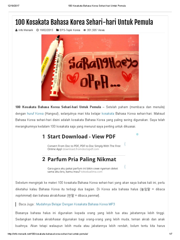 Terdapat 2 file untuk didownload karena jumlahnya yang terlalu besar jika dijadikan 1. Setelah itu baru mengenal kosa kata dan tata kalimat bahasa korea. Kata benda (nouns) berikut adalah daftar kata benda (nouns) dalam bahasa inggris dan artinya dalam bahasa indonesia. Bahasa itu sendiri merupakan sarana sebuah bangsa untuk berkomunikasi. Annyeonghaseo pejuangkorea, pada kesempatan kali ini saya akan share ebook kumpulan kosakata bahasa korea pdf terbaru lengkap.
